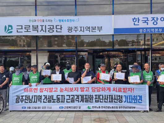 민주노총 전국건설노동조합 광주전남건설지부가 23일 오전 광주 서구 근로복지공단 광주지역본부 앞에서 건설노동자 근골격계 질환 집단 산재 신청 기자회견을 열고 있다. 건설노조 제공. |