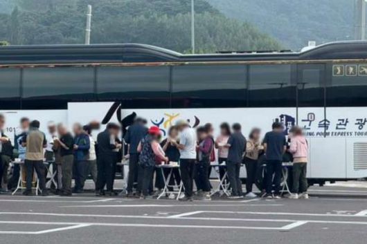 작성자 A씨는 "일요일(21일) 오전, 순천 방면의 진영휴게소 주차장을 관광버스가 점령했다"며 사진을 공개했다. 버스 전용 주차장에 관광버스 두 대가 주차돼 있고 그 사이에서 수십 명이 간이 테이블을 펴놓고 음식을 먹는 장면이 담긴 사진이다.