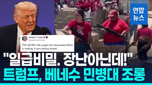 (서울=연합뉴스) 도널드 트럼프 미국 대통령이 22일(현지시간) 소셜미디어(SNS) 트루스소셜에 베네수엘라 민병대 훈련 영상을 공유하고 "일급비밀: 베네수엘라 민병대 훈련 장면을 포착했다. 매우 심각한 위협"이라고 글을 달았습니다.