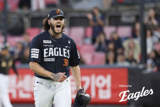 한화 폰세가 20일 수원케이티위즈파크에서 열린 2025 KBO리그 정규시즌 KT전에서 이닝을 마친 후 포효하고 있다. 사진 | 한화 이글스 |