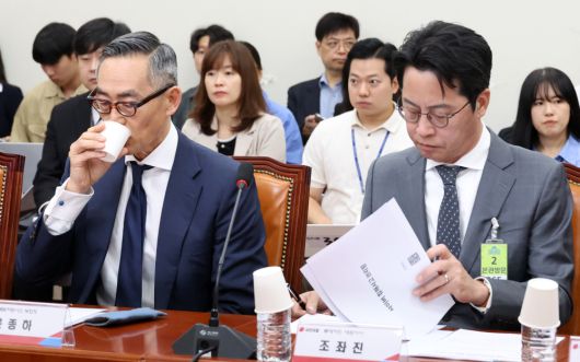 윤종하 MBK파트너스 부회장이 23일 서울 여의도 국회에서 열린 국민의힘 롯데카드 개인정보 유출사태, 피해자 보호 방안 및 재발 방지 대책 간담회에서 물을 마고 있다. 오른쪽은 조좌진 롯데카드 대표이사. 고이란 기자 photoeran@ |