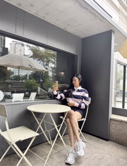사진 속 김사랑은 카페 테이블에 앉아 음료를 즐기거나, 길거리 야외 테이블에 앉아 휴대폰을 보고 있는 모습을 통해 여유로운 일상을 보내고 있다.