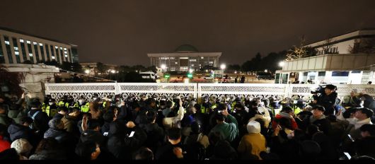 윤석열 대통령이 전격적으로 계엄령을 선포한 3일 밤 서울 여의도 국회 정문 앞에서 경찰병력이 출입을 통제하고 있다.2024.12.3/뉴스1 |