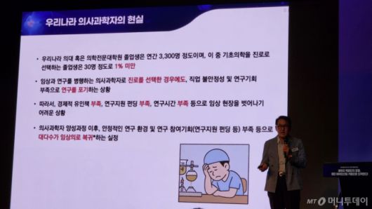 전날(22일) 서울 중구 반얀트리클럽 앤 스파 서울에서 열린 '바이오헬스에서 찾는 포항 미래발전포럼'에서 의사과학자인 서울성모병원 내과 김완욱 교수는 "우리나라 의대·의학전문대학원 졸업생은 연간 3300명 정도(의대생 집단휴학 기간 제외)인데, 이 가운데 기초의학을 진로로 선택하는 졸업생은 30명 정도로 1%도 채 되지 않는다"며 "이마저도 임상과 연구를 병행하는 의사과학자로 진로를 선택한 경우에도 직업 불안정성, 연구 기회 부족으로 연구를 포기하는 상황이 속출한다"고 지적했다.