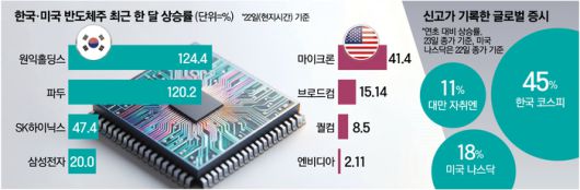 인공지능(AI) 수요에 따른 반도체주 주가 상승이 글로벌 증시를 끌어올리고 있다. 올해 들어 45% 오른 코스피를 비롯해 미국 나스닥, 일본 닛케이225, 대만 자취엔이 반도체 대장주 상승으로 나란히 사상 최고치를 기록했다.