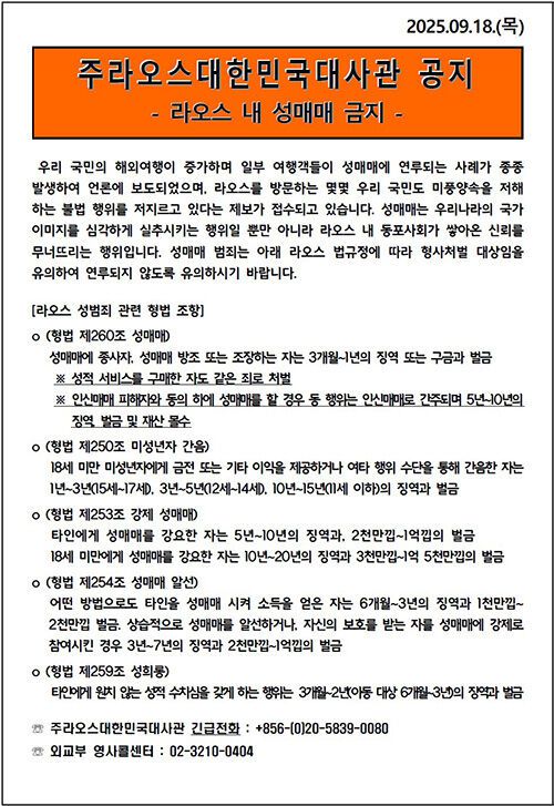 대사관은 특히 "성매매 범죄는 라오스 법 규정에 따라 형사처벌 대상임을 유의해 (성매매에) 연루되지 않도록 유의하시기 바란다"고 강조했습니다.