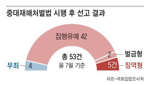 중대재해처벌법에 따르면, 근로자가 사망하는 등 중대한 산재가 발생하면 안전 관리 책임이 있는 사업주나 경영책임자는 1년 이상 징역형 또는 10억원 이하 벌금형에 처한다. 국회입법조사처에 따르면, 2022년 중대재해처벌법이 시행된 이후 법원 판결이 나온 중대재해 사건 53건 중 징역형이 선고된 건 5건이었다. 형량은 징역 1~3년이었다.