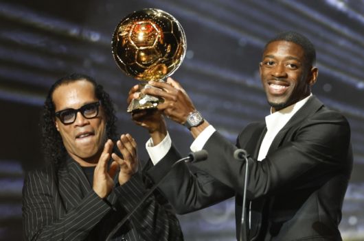 뎀벨레는 23일(한국시간) 프랑스 파리 샤틀레 극장에서 열린 2025 발롱도르 시상식에서 남자 선수 부문 수상자로 선정됐다. 프랑스 출신이 이 상을 받은 건 6번째다. 발롱도르는 2023년까지 아르헨티나 출신 리오넬 메시(8회·인터 마이애미), 포르투갈 출신 크리스티아누 호날두(5회·알나스르)를 중심으로 수여되다가 지난해 스페인 출신 로드리(맨체스터 시티), 올해 1997년생 뎀벨레가 주인공이 됐다. 뎀벨레는 지난 시즌 53경기 35골 14도움으로 팀이 리그1, 프랑스컵(쿠프 드 프랑스), 유럽챔피언스리그(UCL), 슈퍼컵(트로페 데 샹피옹) 등을 석권하는 데 앞장섰다. 그는 시상대 위에서 “전설 호나우지뉴에게 트로피를 받았다. 믿을 수 없다. 이 상은 팀 전체가 이룬 업적”이라고 말했다.