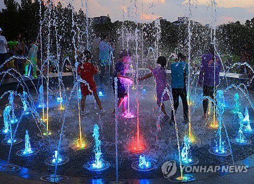 밤 더위 속 분수 물놀이 |