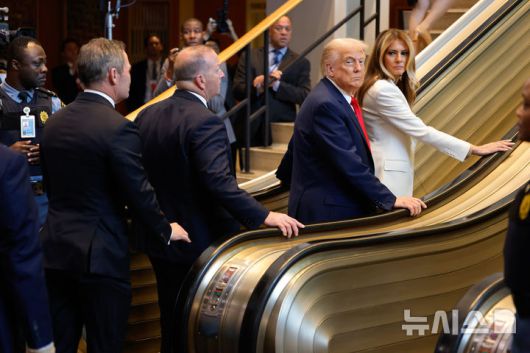 [뉴욕=AP/뉴시스] 도널드 트럼프 미국 대통령과 멜라니아 트럼프 여사가 23일(현지 시간) 미국 뉴욕의 유엔 본부에서 열린 제80차 고위급 회기 일반토의 참석을 위해 에스컬레이터를 이용하고 있다. 트럼프 대통령의 유엔 총회 연설은 5년만이며, 직접 총회장에서 연설하는 것은 2019년 이후 처음이다. 2025.09.24. |