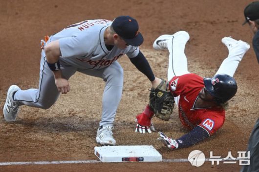 [클리블랜드 로이터 =뉴스핌] 박상욱 기자 = 클리블랜드 유격수 가브리엘 아리아스가 24일 MLB 디트로이트전 2회초 1루에서 견제 아웃되고 있다. 다. 2025.9.24 psoq1337@newspim.com |