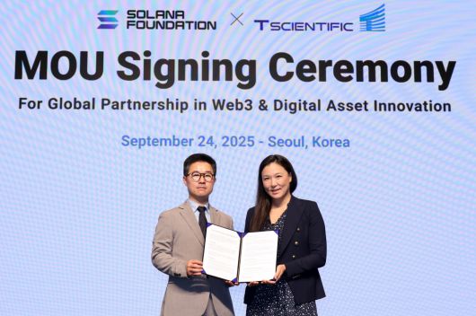 티사이언티픽은 글로벌 퍼블릭 블록체인 선도 기관 솔라나 재단(Solana Foundation)과 대한민국 웹3(Web3) 산업 발전과 디지털자산 생태계 확장을 위한 전략적 업무협약(MOU)을 체결했다고 24일 밝혔다. 이날 협약식에는 유승재 티사이언티픽 대표와 릴리 리우(Lily Liu) 솔라나재단 회장이 참석했다.