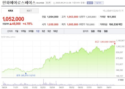 24일 한국거래소에 따르면 방산 선도주 한화에어로스페이스는 오전 10시 45분 현재 전일대비 4만8000원(4.78%) 상승한 105만2000원에 거래되고 있다. 6거래일 만에 반등한 한화에어로스페이스는 이날 장중 106만3000원까지 오르면서 52주 신고가를 경신했다.