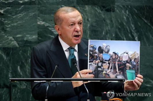 23일(현지시간) 에르도안 대통령은 뉴욕 유엔본부에서 열린 제80차 유엔총회 연설에서 가자지구의 굶주린 아이들을 촬영한 사진을 직접 들어 보이며 "인간성의 최저점"이라고 표현했다.
