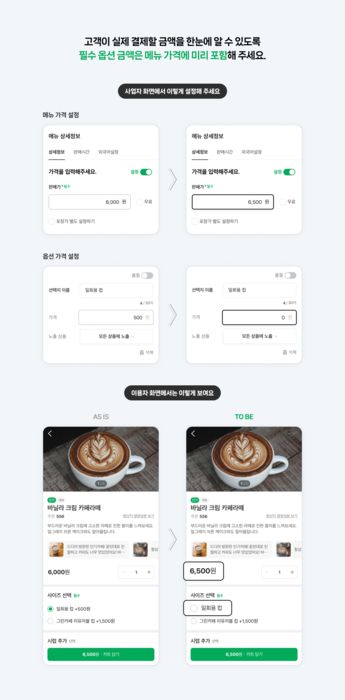 네이버는 구체적으로 필수로 선택해야 하는 옵션은 기본 메뉴 가격에 미리 포함하도록 기준을 설정해 고객이 실제 결제할 총 금액을 미리 알 수 있도록 개선했다. 필수 옵션에는 '추가금 없는(0원) 선택지'를 최소 1개 이상 설정해야 한다. 필수로 선택해야 하는 옵션에 추가금을 부과하지 못하도록 막은 셈이다.