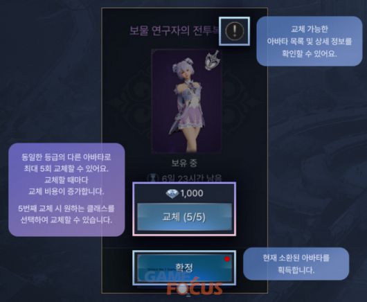 높은 등급의 아바타를 소환 후 보유 목록에 보이지 않는다면 당황하지 말고 '아바타 확정'을 하자. 영웅 등급 이상의 아바타를 소환하면 '아바타 확정'을 해야만 사용 가능하다. 내가 원하지 않는 아바타가 나왔다면 동일 등급 내에서 최대 5회 교체할 수 있다. 더불어 '더 스타라이트'의 캐릭터들은 각자 두 종류의 클래스로 나뉘어져 있는데, 아바타를 장착해 이 클래스를 자유롭게 변경할 수 있다.