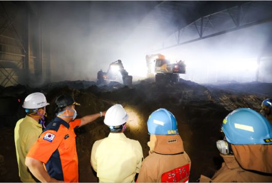 지난 18일 정인화 광양시장 등이 전남 광양항 동측 배후단지 물류창고에서 화재가 발생한 현장을 살펴보고 있다. 광양시 제공 |