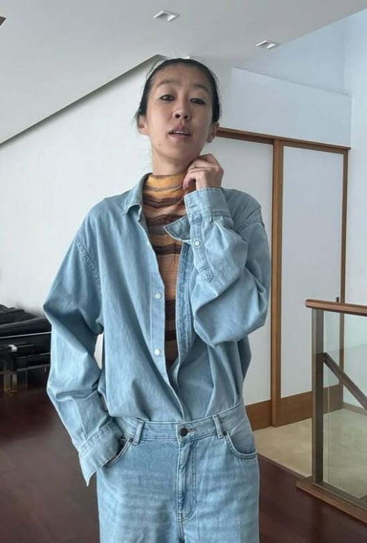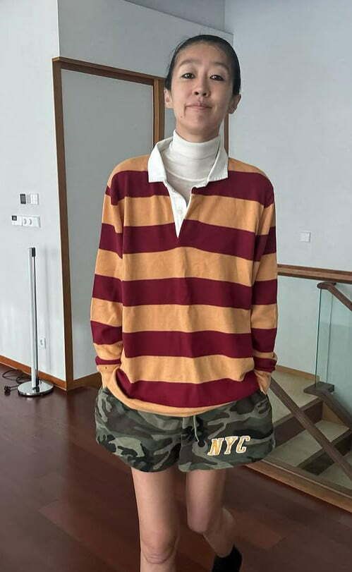 공개된 사진 속 홍진경은 목폴라에 스트라이프 티셔츠를 레이어드하고 반바지를 매치한 스포티한 가을 패션을 선보였다.