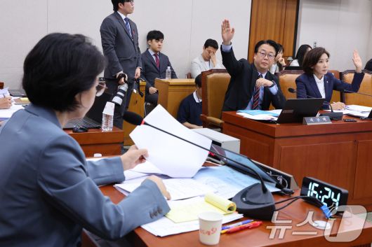 (서울=뉴스1) 신웅수 기자 = 나경원 의원을 비롯한 국민의힘 의원들이 24일 서울 여의도 국회에서 열린 법제사법위원회 전체회의에서 거수 투표를 하고 있다. 2025.9.24/뉴스1phonalist@news1.krCopyright ⓒ 뉴스1. All rights reserved. 무단 전재 및 재배포, AI학습 이용 금지.