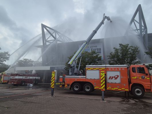 24일 부산 강서구 강서체육공원 실내체육관 인근에서 이같은 경고방송이 울려퍼졌다. 경고방송 직후 실내체육관에서 매캐한 연기와 함께 실내체육관 내부에서 화재가 발생했다는 방송이 나왔고, 관람객들은 다급하게 실내 체육관에서 뛰쳐나오기 시작했다.