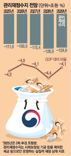 국가재정운용계획에 따르면, 국민연금과 같은 사회보장성 기금을 제외하고 세금 등으로만 운영하는 실질적인 재정 상태를 보여주는 지표인 관리재정수지 적자는 내년 GDP 대비 4.0%에서 2028년 4.4%까지 확대된다. 또 국가채무비율은 내년 51.6%에서 2029년 58.0%까지 상승할 전망이다. 지난해 전망에선 2028년이 돼야 국가채무비율이 50%를 넘어설 것으로 예측됐지만, 내년도 예산안에 대규모 정부지출이 포함되면서 도달 시기가 2년 앞당겨진 것이다.