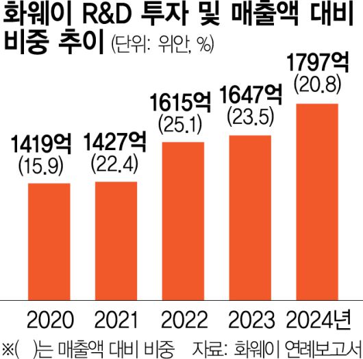 미국이 화웨이를 본격적으로 제재하기 시작한 2019년 이후 화웨이는 R&D 투자를 늘리며 기술 독립에 박차를 가하고 있다. 이전까지 매출액 대비 15%대에 그쳤던 R&D 투자 비용은 2021년 22.4%로 훌쩍 뛰었고 지난해까지 20%대를 꾸준히 유지하고 있다. 지난해 화웨이의 R&D 투자 비용은 1797억 위안(약 35조 2000억 원)에 달한다. 내년도 우리 정부의 R&D 예산(35조 3000억 원)과 맞먹는 수준이다.