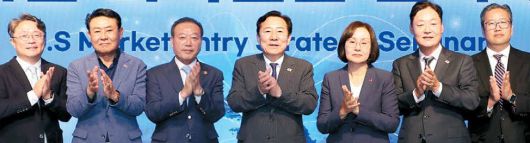 24일 제주 서귀포시 롯데호텔에서 열린 '중기 미국 진출 전략 세미나'에서 참석자들이 사진을 찍고 있다. 왼쪽 둘째부터 강동한 한호산업 대표, 황병구 미주한인상공회의소총연합회장, 김기문 중소기업중앙회장, 바니 리 한미은행장, 박기홍 허브인터내셔널 보험 회장. 중기중앙회 |