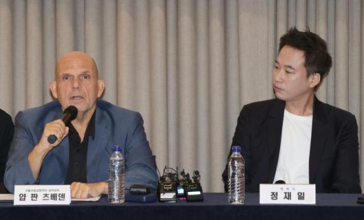 Jaap van Zweden, music director of the Seoul Philharmonic Orchestra, delivers opening remarks at a press conference announcing this year’s new commission at The Prima Art Center in Jongno-gu, Seoul, on September 23. At right is composer Jung Jae-il. / Yonhap News |