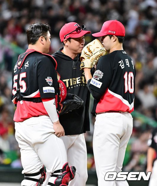 [OSEN=인천, 박준형 기자] 23일 오후 인천 SSG랜더스필드에서 ‘2025 신한 SOL BANK KBO리그’ SSG 랜더스와 KIA 타이거즈의 경기가 진행됐다.이날 경기에서 SSG은 김건우를, KIA가 김태형을 선발투수로 내세웠다.5회말 2사 KIA 이동걸 투수 코치가 마운드 올라 김태형 선발투수와 이야기를 나누고 있다. 2025.09.23 / soul1014@osen.co.kr |