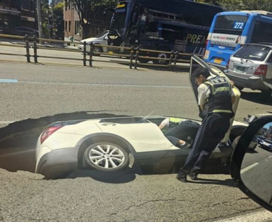 서울 서대문구 연희동에서 발생한 싱크홀에 지난해 8월 차량이 빠져 있다. 온라인 커뮤니티 갈무리 |