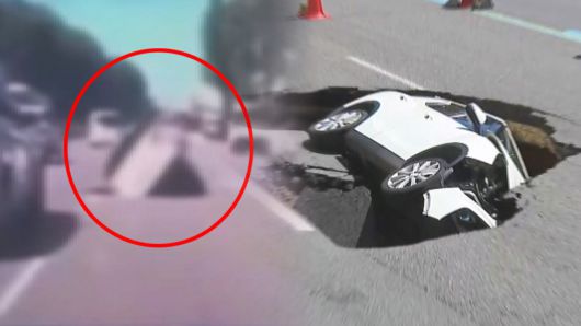 갑자기 도로 한가운데 큰 구멍이 뚫립니다.