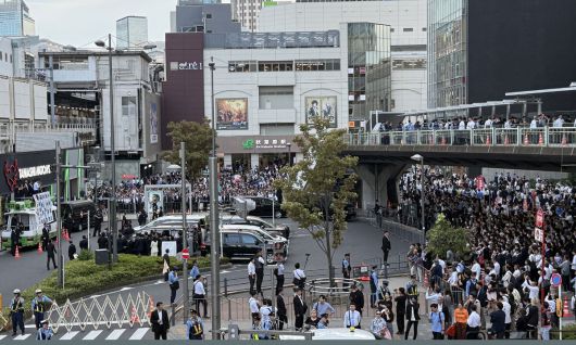 24일 일본 도쿄 아키하바라역 근처에서 시민들이 삼엄한 경비 속에 열린 자민당 총재선거 합동연설회를 지켜보고 있다. 도쿄=유태영 특파원 |
