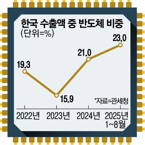 24일 관세청에 따르면, 올해 1~8월 중 반도체 수출액은 1042억94만달러로 전년 동기 대비 15.7% 증가했다. 이에 따라 반도체가 한국의 전체 수출액에서 차지하는 비중이 23.0%로 높아졌다. 2023년까지만 해도 전체 수출액의 15.9%였던 반도체 비중은 지난해 21.0%로 올라선 데 이어 올해 비중이 더 확대된 것이다.