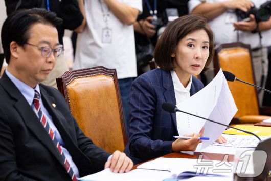 나경원 국민의힘 의원이 24일 서울 여의도 국회에서 열린 제429회 국회(정기회) 법제사법위원회 제6차 전체회의에서 의사진행발언을 하고 있다. 2025.9.24/뉴스1 ⓒ News1 유승관 기자 |
