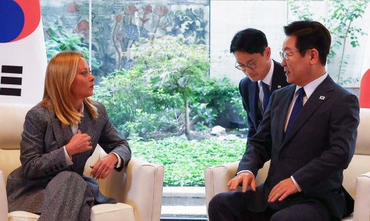 이 대통령은 25일(현지시각) 한-이탈리아 정상회담을 열어 멜로니 총리에게 “양국이 지리적 위치나 국민성 등 여러 측면에서 공통점을 갖고 있다고 하고, 전략적 동반자 관계를 토대로 양국 정부와 기업이 인공지능(AI), 방산 등 분야에서 호혜적 협력을 심화 발전시켜 나가자”고 했다.