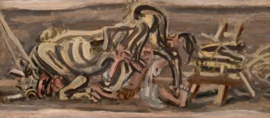 해당 작품은 머리를 땅에 대고 부리부리하게 눈을 뜬 소의 뒷다리 사이에 어린아이가 엉켜 있는 듯한 모습을 띠고 있다. 1955년 당시 미도파 화랑에서 열린 개인전에서 처음 공개된 후, 지난 6월 별세한 정기용 원화랑 대표가 구매해 지금껏 70년을 소장해왔다.