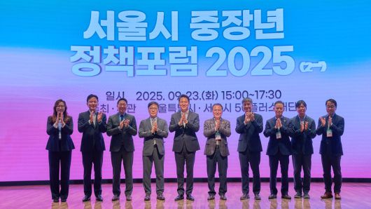 ▲ '서울시 중장년 정책포럼 2025'에서 발표자들과 기념촬영 하는 오세훈 시장