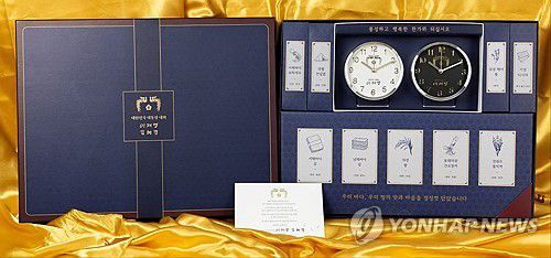 이번 추석 선물은 이 대통령의 서명이 담긴 탁상시계와 8도 수산물, 경북 의성 쌀 등으로 구성된다.