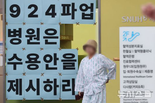 [서울=뉴시스] 권창회 기자 = 서울대학교 병원 노조의 전면 무기한 파업 이틀째인 25일 오전 서울 종로구 서울대병원에 파업 관련 문구가 붙어있다. 2025.09.25. kch0523@newsis.com |
