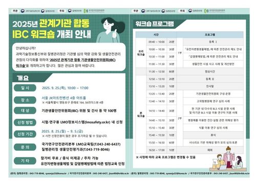 ▲ 과학기술정보통신부와 질병관리청은 25일 서울 영등포구 JK아트컨벤션에서 '2025년 관계기관 합동 기관생물안전위원회(IBC) 워크숍'을 개최했다고 밝혔다. 이날 행사는 생물안전 관리자의 역량을 강화하고 네트워크 형성을 유도하기 위해 마련됐다. 생물안전이란 생명과학 분야 연구 과정에서 사람과 환경의 안전성을 확보하는 것을 가리킨다. 유전자 재조합 실험을 하거나 고위험 병원체 등 감염 가능성이 있는 생물체를 취급하는 기관은 생물안전 관리를 위해 기관 내 자체 조직으로 기관생물안전위원회를 운영해야 한다. 현재 약 800개 기관에 위원회가 설치돼 있다. (서울=연합뉴스)
