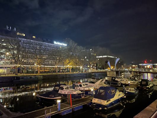 브리스톨 시내 중심 워터프런트 지역에 위치한 4성급 더브리스톨호텔(The Bristol Hotel)과 에이번 강(Avon River) 야간 전경 |