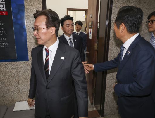 김민석(왼쪽부터) 국무총리와 강훈식 대통령 비서실장, 정청래 더불어민주당 대표가 25일 국회 민주당 대표실에서 금융정책·감독분리 관련 긴급 고위 당·정·대 회의를 마친 뒤 빠져 나오고 있다. [연합] |