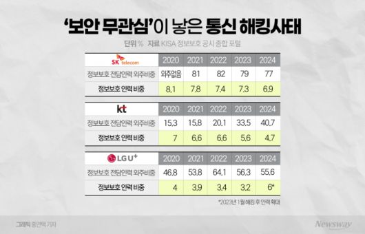 [뉴스웨이 임재덕 기자]최근 통신업계를 강타한 '해킹 사태' 이면에는 돈벌이에 혈안이 돼 보안을 외면해 온 부적절한 경영철학이 있다는 분석이 나온다. 수년간 정보보호 인력 비중을 낮추면서, 그마저도 외주로 돌려온 사실이 이를 방증한다. 업계에서는 보안이 국가 기간통신사업자의 근간인 만큼 원점부터 재정비해야 한다고 지적한다.