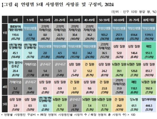 사망 원인별로는 암, 심장질환, 폐렴이 여전히 ‘3대 사인’으로 꼽히며 전체의 42.6%를 차지했다. 암으로 인한 사망은 전체의 24.8%였고, 암 사망률은 10만명당 174.3명으로 전년보다 4.5% 증가했다. 이 가운데 폐암·간암·대장암이 가장 많았다.