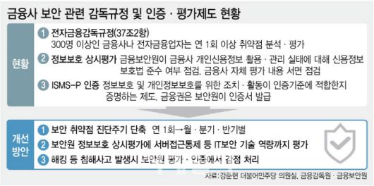 금융사가 감독 규정을 충족했는지 금융감독원과 금융보안원이 주로 사후적으로만 확인한다는 것도 문제로 지적된다. 연 1회 규정을 잘 지켰는지를 서류 점검이나 인증 심사로 확인하는 데 그치다 보니 그 사이 발생하는 취약점이나 패치 누락을 적시에 걸러내지 못하는 상황이다. 보안업계 관계자는 “사고가 터지고 나서야 뒤늦게 조사하는 ‘사후 감독’ 체계로는 선제 방어를 할 수 없다”며 “금감원과 금보원이 상시 점검, 상시 모니터링 기능을 강화하지 않는 한 비슷한 사고가 반복될 수밖에 없다”고 말했다.