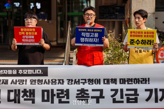 전국민주일반노동조합 등은 25일 강서구청 앞에서 기자회견을 열고 “환경미화원들의 ‘진짜 사용자’인 강서구청은 관리·감독 책임을 다해 노동자들이 죽지 않도록 안전 대책을 마련하라”고 요구했다.