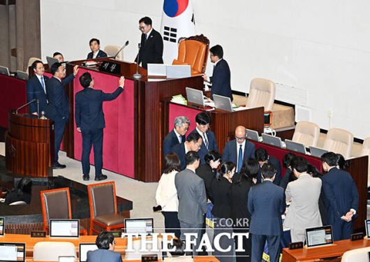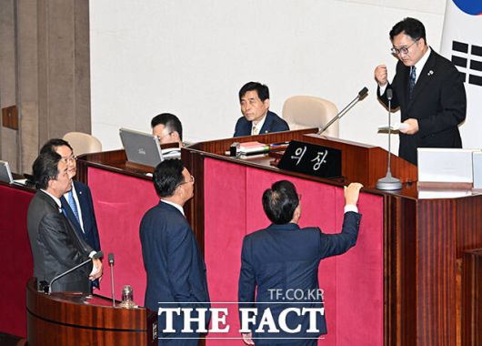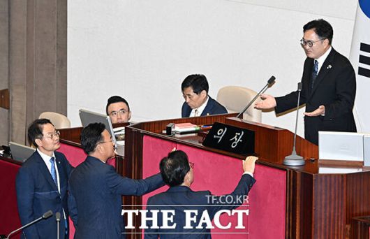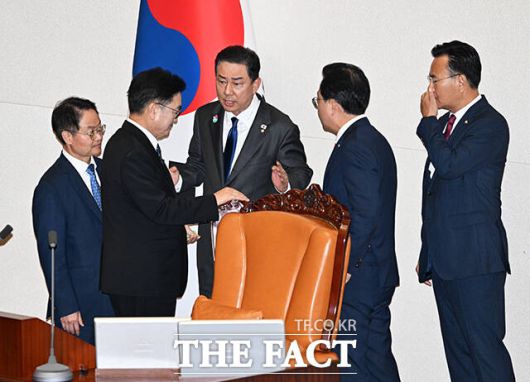 [더팩트ㅣ국회=배정한 기자] 우원식 국회의장(오른쪽)이 25일 오후 서울 여의도 국회에서 열린 본회의에 참석해 민주유공자 예우에 관한 법률안에 대한 신속처리안건 지정동의의 건 무기명 투표 중 명패수보다 투표수가 많은 상황이 발생해 여야 원내대표에게 국회법을 설명하고 있다.