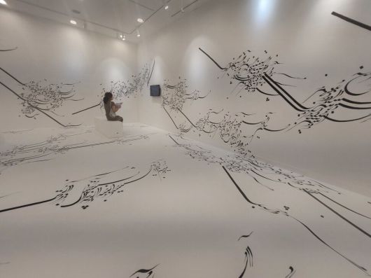 아랍 문자를 힘차게 물결치는 듯한 이미지로 표현하며 전시장 벽과 바닥을 덮은 이란 작가 파라스투 포로우하르의 설치 작품 ‘쓰여진 방’(Written Room). 전남수묵비엔날레 본전시장 격인 목포문화예술회관 4전시실에서 볼 수 있다. 노형석 기자 |