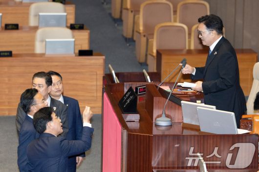 (서울=뉴스1) 이승배 기자 = 25일 서울 여의도 국회에서 열린 제429회국회(정기회) 9차 본회의에서 공익신고자 보호법 일부개정법률안에 대한 신속처리안건(패스트트랙) 지정동의의 건 등에 대한 무기명 투표 후 투표수가 의원 명패 수보다 1개 많자 송언석 국민의힘 원내대표가 우원식 국회의장에게 항의하고 있다. 2025.9.25/뉴스1
