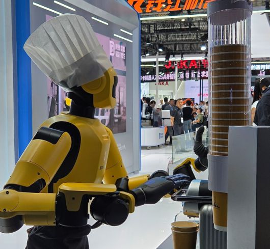 24일 중국 상하이 국제컨벤션센터에서 열린 ‘2025 로봇박람회’에서 중국 기업 ‘덱스포스’의 휴머노이드 로봇이 관람객에게 커피를 내리고 있다. 상하이 곽소영 기자 |